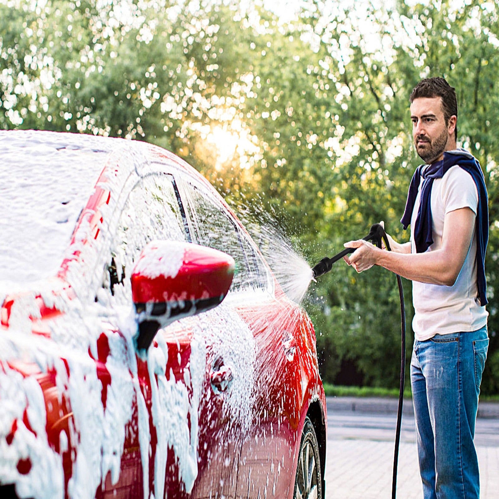 Jet wash cleaner comes with high pressure trigger gun, 10 meters high pressure hose, inlet filter, quick connector, foam detergent bottle and adjustable nozzle. Suitable for home, patio, car cleaning.