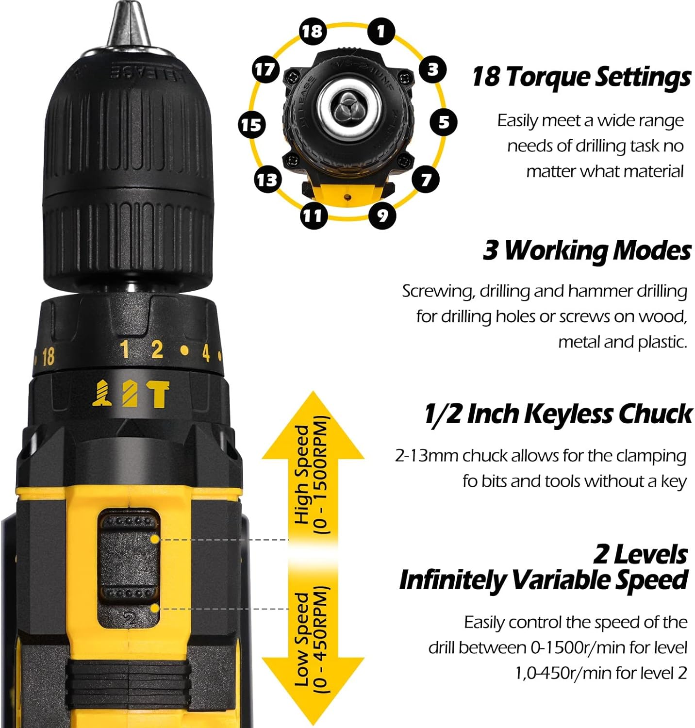 - 【2-speed Variable Speed】2-speed speed (0-450RPM and 0-1500RPM), maximum torque 45NM, suitable for various drilling, driving and hammering applications. Stepless speed regulation, the speed can be adjusted by pressing the light and heavy.