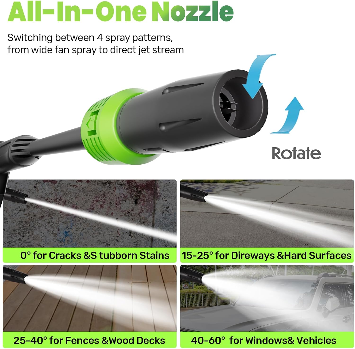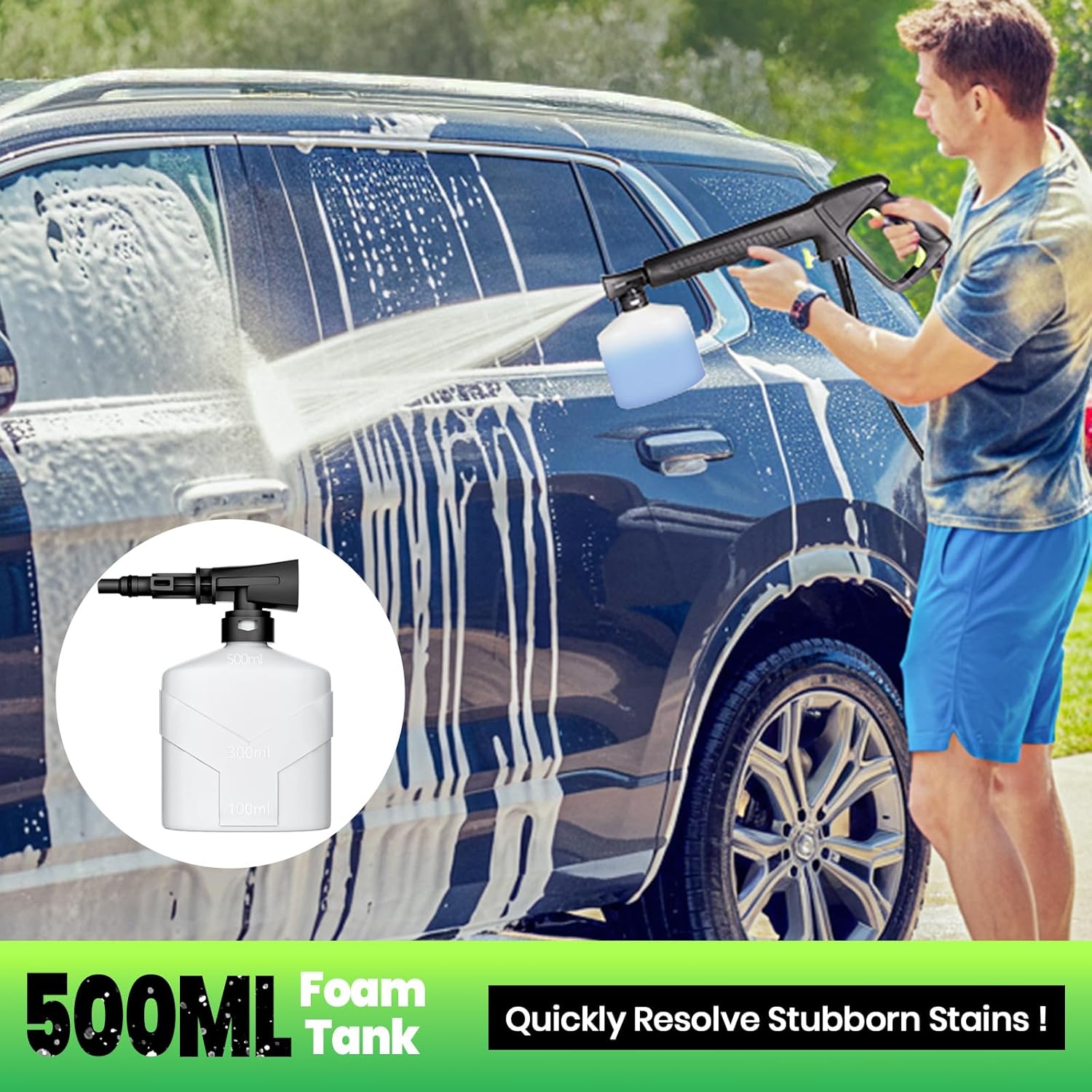 - [Adjustable Nozzle & Brush & Foam Cannon]The pressure washers' rotating nozzle adjusts the water flow angle from wide fan spray to direct jet stream, eliminating frequent nozzle changes.The fix brush removes dirt and stains effectively.Simplify cleaning with the 500ML Foam Cannon—directly connects to your pressure washer spray gun.