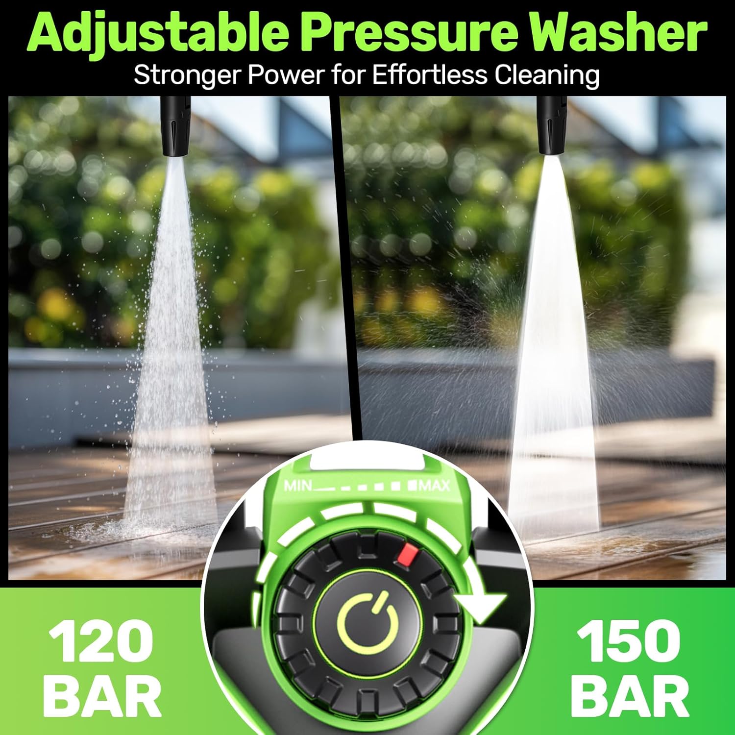 - [Adjustable Pressure Switch]The jet washers pressure washers feature an adjustable pressure function. Turning the dial clockwise increases the pressure, up to a maximum of 150bar. Easily switch between pressure and flow rates to meet various cleaning needs by rotating the knob.