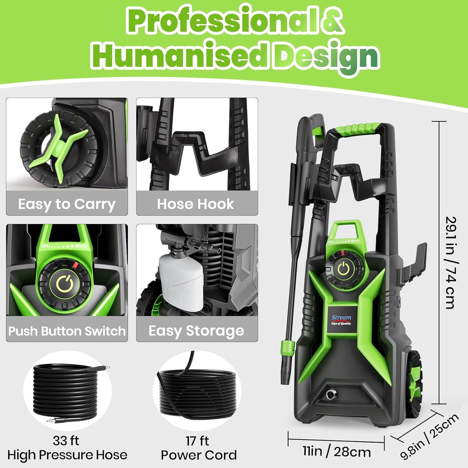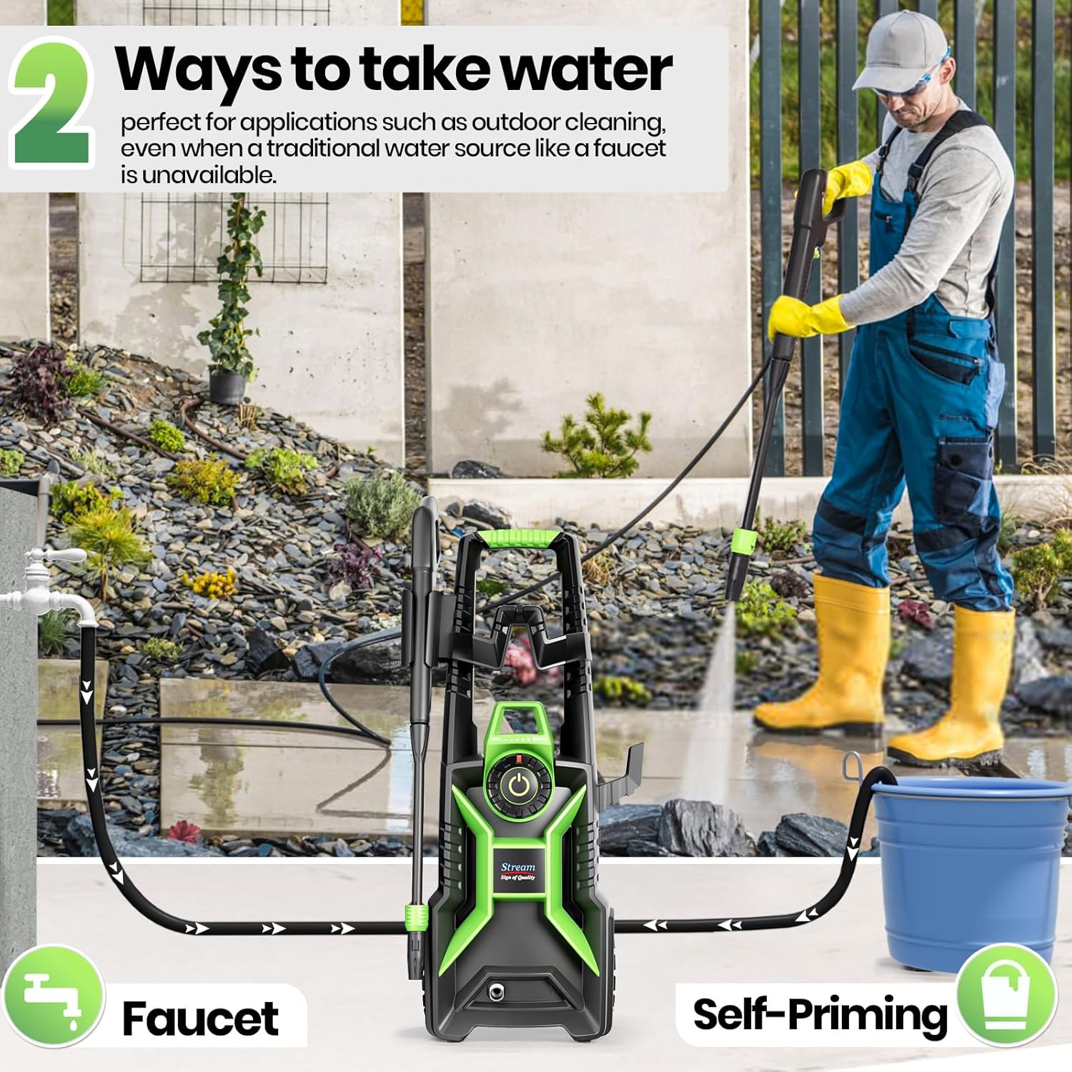- [Self-Priming Pressure Washer]The pressure washers provides users with the flexibility to access distant cleaning areas with ease. The flexible 17ft hose and 33ft power cable connection system enables users to draw water from multiple sources, including water taps and buckets.