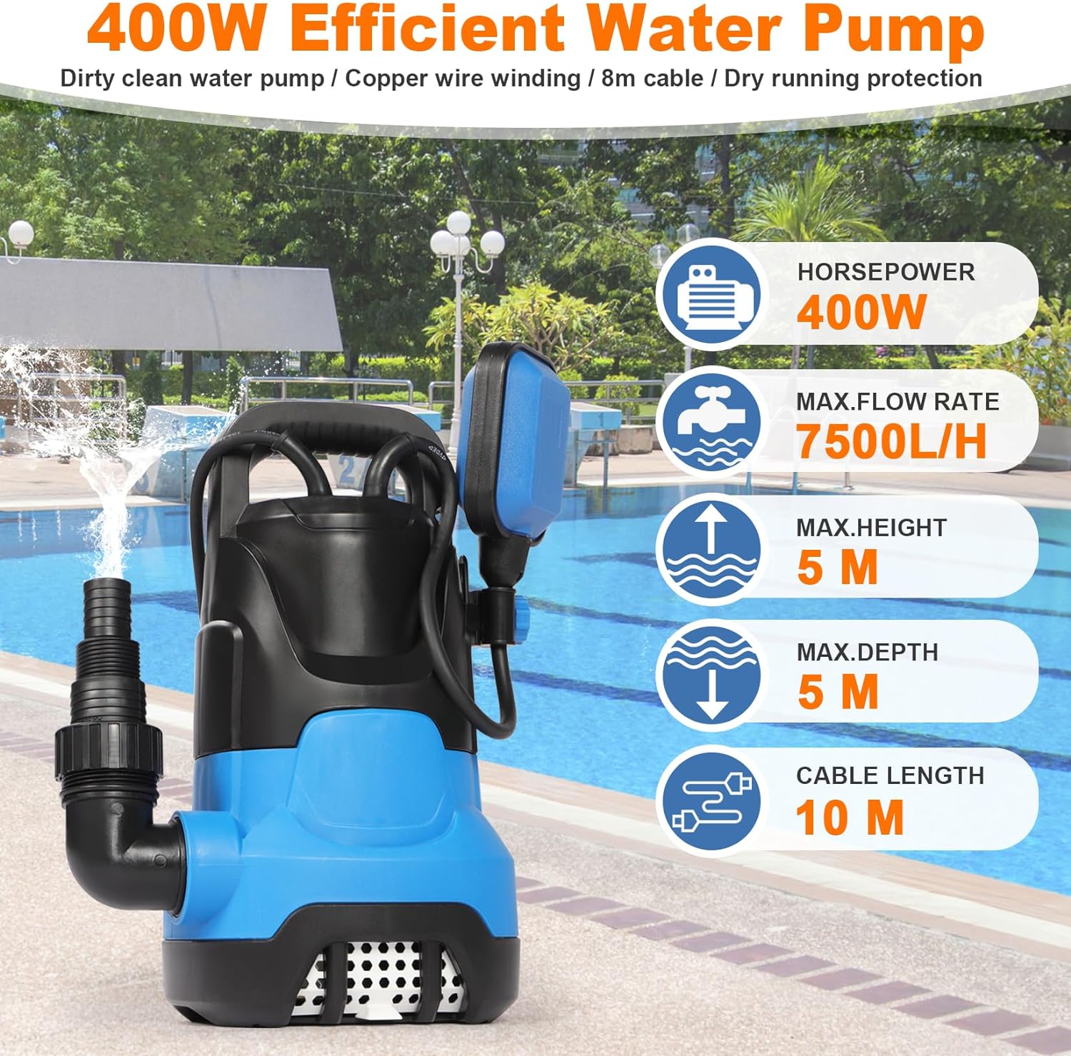 - 【Fast Drainage】This pump provides fast drainage with a stable 400W power, 100% copper winding, and a flow rate of 7500L/h. It features an 8-blade impeller and a 5m head lift, ensuring optimal performance and increased efficiency. The Submersible pump body is made of lightweight, corrosion-resistant PP material, weighing 4 kilograms for easy portability.
