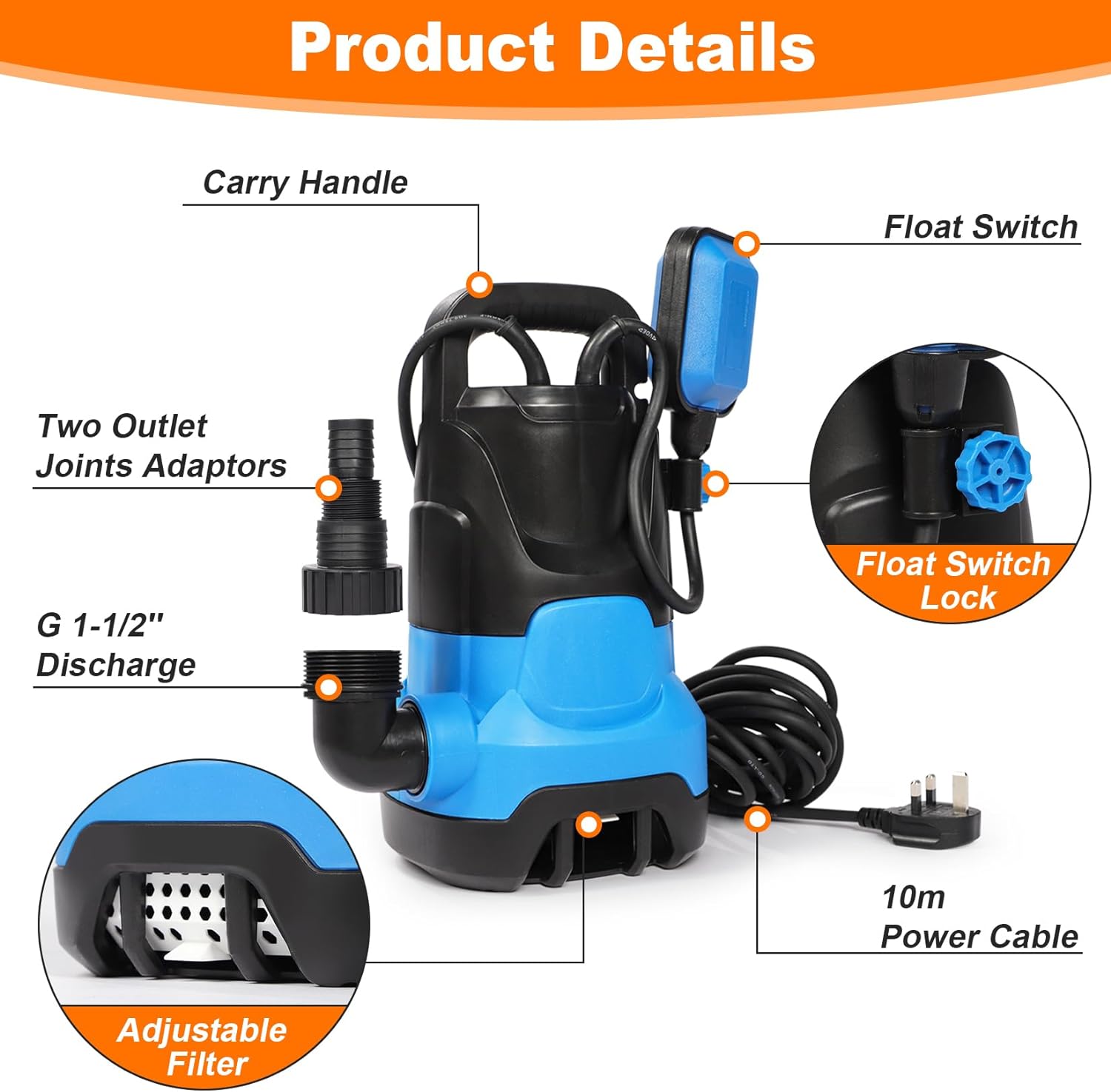 - 【Safe and Durable】 The water pump features a fully corrosion-resistant and reinforced thermoplastic structure, equipped with thermal overload protection, making it suitable for continuous use in drainage applications. It is suitable for home, garden, water, pool, and swimming pool use.